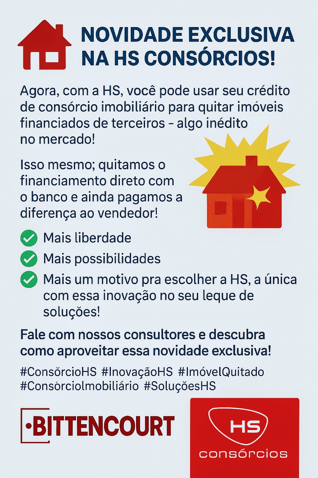 🏡 NOVIDADE EXCLUSIVA NA HS CONSÓRCIOS! Agora, com a HS, você pode usar seu crédito de consórcio imobiliário para quitar imóveis financiados de terceiros! 💥 Isso mesmo: quitamos o financiamento direto com o banco e ainda pagamos a diferença ao vendedor! ✔️ Mais liberdade ✔️ Mais possibilidades ✔️ Mais um motivo pra escolher a HS, inovação no seu leque de soluções! 💬 Fale com nossos consultores e descubra como aproveitar essa novidade exclusiva!